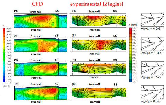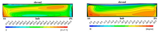 The flow structure in the absolute frame can be discussed with the aid of the local velocity triangle sketched in Figure 13. High absolute velocities and tangential flow direction characterize the wake zone (neglecting the flow distortion at the endwalls) while low absolute velocities and radial flow direction are encountered in the jet zone, as shown in Figure 14. The relative angle distortion close to the blades is the reason for lower PS and higher SS absolute velocities. The absolute velocity maximum value occurs approximately at 70% of the channel height. The above considerations explain the Mach number distribution along z/b direction presented in Figure 8 and the total pressure curves of Figure 7. A very similar flow structure is observed for the operating point M (Milingi, 2016) [31].