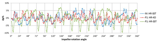 Two types of fluctuations are visible: a former with a high frequency and a latter with a low frequency, which corresponds to three times the impeller rotational frequency. The former is caused by the impeller blade passage while the latter is probably due to downstream disturbances (e.g., diffuser vane edges). The simulation for the operating point P1 with the HR-KO model shows lower fluctuations compared to the results with the HR-SST model. In the case of operating point M, the HR-SST model shows similar high frequency oscillations but greater low frequency oscillations. Therefore, the SST tends to generate stronger downstream disturbances, as confirmed by the P1 with HR-SST case where high frequency oscillations are also much more evident. This is assessed as the reason for the stall detection at the operating point P1 using the SST model. The stall would be a rotating stall, passing to the neighboring diffuser vanes, but with the 3-vane periodic model, the simulation of the phenomenon is inhibited.
