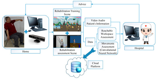 This study proposes a novel cloud rehabilitation system for the upper limb based on motion tracking, as shown in Figure 1. It connects patients at home and doctors in hospitals through a cloud platform to improve the effectiveness of home rehabilitation. In this system, a 3-dimensional reachable workspace virtual game (3D-RWVG) for upper limb rehabilitation is proposed. Upper extremity performance parameters, including relative surface area (RSA), mean velocity (MV), logarithm of dimensionless jerk (LJ), and logarithm of curvature (LC), are analyzed to assess upper limb motor function. The two-headed convolutional neural network (TCNN) method is used to establish assessment models for the selected five motions. The therapist could examine the assessment reports from the cloud platform, and develop a plan for the patient’s next rehabilitation training. In this paper, a comprehensive method is proposed to train and evaluate the upper limb motor function of patients not only from the specific movement but also from the global movement.