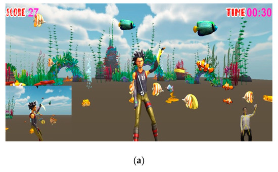 The game scene was designed on a sea floor environment with the aim of obtaining fish and gold coins. Figure 3a shows the game scene. In the figure, the side view is in the lower left corner, and the subject’s image is in the lower right corner. The avatar, coral, seaweed, stones, and fish models (i.e., various kinds of fish, including clownfish, green turtle, starfish) are added to the scene. In order to make the scene more vivid and increase the immersive sense of participants, special effects are added in the scene, including an atomization effect, rising bubbles, swaying plants in the water, and fish with a swimming animation.