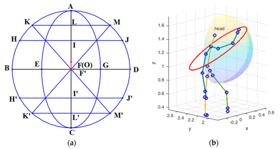 According to the upper extremity motion in reference [28,29], the paths of fish were designed. In the game, fish come into sight randomly from three directions: upper, left, and right. When the distance between fish and the avatar is equal to the length of the tested arm, the fish will swim by the designed path. Figure 4a shows the designed paths; the coordinate system of the game space is determined based on the Kinect’s coordinate system, with the shoulder joint used as the reference point. The paths were designed separately in four directions: vertical direction, horizontal direction, oblique direction, and backward direction. The datum plane of the path division is the horizontal plane and the vertical plane passing through the shoulder joint, similar to the latitude and longitude of the earth.
