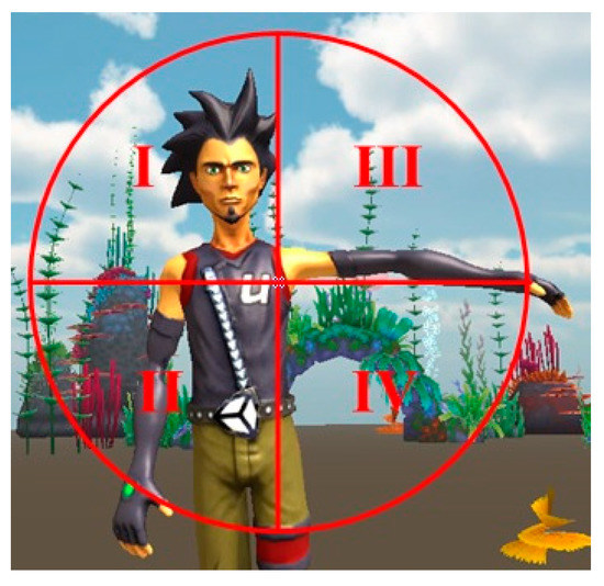 The ideal upper limb reachable workspace is a part of spherical enclosure with a radius of the arm expansion length. The reachable workspace is divided into four quadrants (I, II, III, and IV) in which each quadrant corresponds to a quarter of a sphere. The shoulder joint is defined as the coordinate origin, the horizontal is the direction in which the arm extends horizontally, and the vertical direction is parallel to the direction in which the subject stands. The avatar is mirror controlled by the subject, so the coordinate system and four quadrants are shown mirrored in Figure 6.