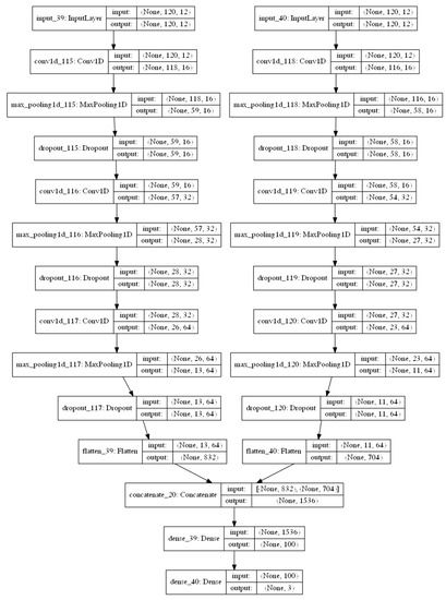The TCNN had two heads, each with layers. The left head had three different 1D CNN layers with 16, 32 and 64 filters separately; the kernel size of each layer was three, and the activations were relu(Rectified Linear Units). Then, each followed a MaxPooling1D layer with (2 × 2) pool size. The dropout layer was used to prevent neural networks from overfitting, after each MaxPooling1D layer. Then the learned features were flattened to one long vector. The right head network has the same structure as the left one, besides the kernel sizes, which were five. Before making the prediction, the interpretations from both head were connected within the model and interpreted by a fully connected layer with the relu activation. The network was optimized by the adam (Adaptive Moment Estimation) version of the stochastic gradient descent. The loss function was categorical_crossentropy. For the model and evaluation, the epoch was 50 and batch size was 32.