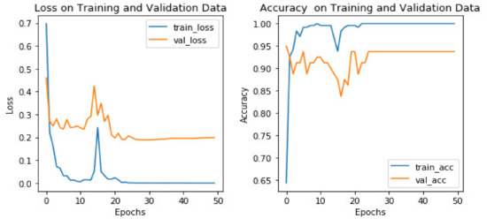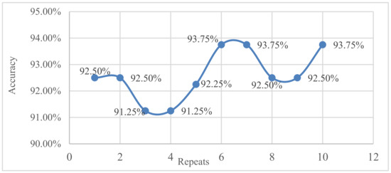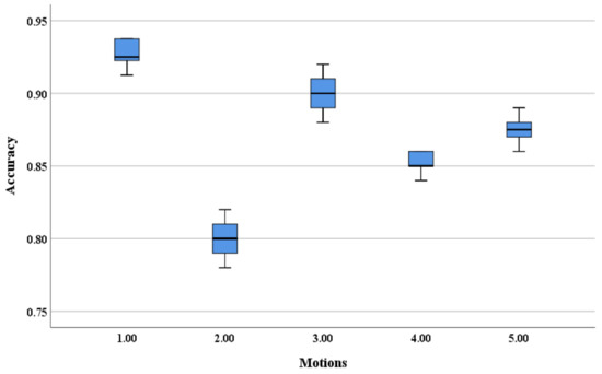 To assess the motor function of the affected upper limb, the TCNN models were established for the five motions. The 10-time evaluation accuracy for the motion shoulder abduction (90°) is shown in Figure 11. The mean is 92.6% and the standard deviation is 0.0088. This indicates that the recognition result of the TCNN model is stable. Figure 12 shows the loss and accuracy on training and validation data in 50 epochs. This graphic indicates that after 25 epochs, the classification results tend to be stable, and the accuracy of the model is 93.75%. The accuracy of the five motion models is shown in Figure 13. The model accuracy means for motions 1–5 are 92.6%, 80%, 89.5%, 85.1% and 87.5%, respectively.