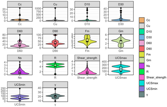 Data quartiles and probability densities (shaded color areas) and outliers (box-and-whisker plots) are illustrated in Figure 1 via violin plots (VIP), which combine density estimates and box plots in displaying the data structure. The top of the plot, the center of the plot and the bottom of the plot show the maximum value, the median value and the minimum value, respectively. The third quartile and the first quartile are represented as the bottom of the thick line and the top of the thick line, respectively, in the center of the VIP. Figure 1 shows the relevant input indicators that are applied to develop the shear strength of the RFM prediction models associated with their mean, range and outputs. The main advantage of the VIP, compared to a box plot, is that the VIP presents the density. A wider VIP corresponds to a higher density. Considering the VIP for Ns in Figure 1 as an example, the minimum and maximum, which are represented by the bottom of the VIP and the top of the VIP, are approximately 0 and 4.5, respectively. The median, which is denoted by a white dot, is approximately 0.5. The highest density occurs for the value 0.3 (i.e., the violin is widest near 0.3), but the high values (between 3 and 4) have a small density (i.e., the pointy top of the VIP near 4). The relationship between the shear strength of RFM and other input indicators is demonstrated in the correlation matrix plot (see Figure 2), which can be observed as the pairwise relationship between two indicators with corresponding correlation coefficients for each indicator. The conclusion that some of the parameters have a relatively satisfactory correlation is obtained. A high parameter of shear strength is correlated with Ns. Barton [1] also noted that the shear strength of rock joints and rockfill exhibits a strong relevance. As demonstrated in Figure 1, some indicators with significant skewness can have an impact on prediction models. In this study, all variables were transformed by the approach of the Box-Cox [32]. Thus, the original data can be conformed to a normal distribution, and the indicators have also been centered and scaled before random forests and Cubist models are conducted.