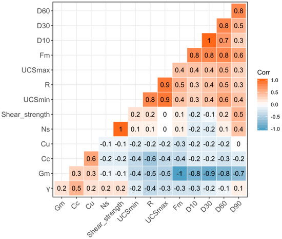 Similarly, the random forests model in this database used 13 previously mentioned parameters. Compared with other indicators for the prediction of the shear strength of RFM, Ns and D10 are the two most influential parameters, followed by the indicators D90, Gm, D30, Fm, D60, Cu, γ, R, Cc, UCSmin and UCSmax, as depicted in Figure 7b. Interestingly, the min UCS and max UCS indicators did not contribute to the performance of the proposed models. These results are also consistent with the correlation matrix of the variables that have the highest coefficients for these variables. The findings demonstrated that the Cubist and random forests predictors are more sensitive to the indicators of normal stress and material gradation properties but are not sensitive to min UCS and max UCS. This result implies significant guidance for exploring the characteristics of the shear strength of RFM. Similar research of sensitivity analyses on this topic was also implemented by Kaunda [20], who reported the rankings of the following input parameters: normal stress, minimum particle strength, dry unit weight, 10% passing sieve size, the coefficient of curvature of the particle size distribution, and the coefficient of uniformity of the particle size distribution in decreasing order of significance, which shows agreement with the previously mentioned results. Note that more data about the in-situ shear strength of RFM need to be supplemented to yield more reliable importance scores of random forests and Cubist models for influential variables in future research.