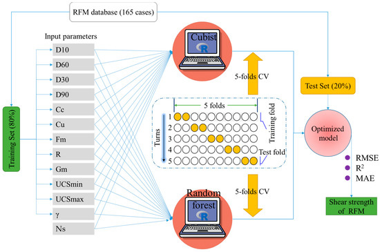 Considering that large-scale strength tests to characterize the shear strength are challenging, supervised machine learning algorithms [21,22,23,24,25,26,27] based on random forests [28,29,30,31,32] and Cubist [33,34,35,36] development models are proposed to predict the shear strength of RFM in this paper. Compared with conventional statistical learning methods, the Cubist and random forests models are able to generate a more comprehensive predictive accuracy. For regression tasks, the main advantages are (a) the minimized risk of overfitting, (b) the relatively small number of effective tuning hyperparameters, (c) the possible inclusion of various predictor variables (either categorical or continuous), and (d) variable importance can be automatically obtained to interpret the variable contribution mechanism in the final predictor model. In this regard, random forests and Cubist models are employed to capture the non-linear relationship between the shear strength of RFM and various predictors, the developed models are evaluated using cross-validation, and the performance of the proposed models are compared with the models of ANN and multiple linear regression.