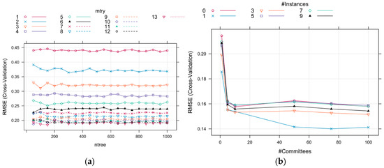 Fivefold cross-validated RMSE profiles for determining the optimal tuning parameters: (a) Random forests model, and (b) Cubist model.