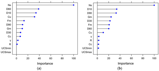 The importance of influencing variables can be individually evaluated by the feature importance to aid in the interpretation of previous results based on the decrease of Gini impurity when a variable is chosen to split a node [32]. The sensitivity analysis of the indicators is conducted to determine the degree of contribution of each variant indicator among all estimation cases. The Cubist model in this database employed the 13 parameters of D10, D30, D60, D90, Cc, Cu, Gm, Fm, R, UCSmin, UCSmax, γ and Ns. The results for the Cubist model are given in Figure 7a, which demonstrates the relative variable importance for the final Cubist model. Among all indicators in the final Cubist model for the prediction of the shear strength of RFM with the given dataset, Ns and D60 are the two most influential parameters, followed by the indicators D10, Cu, Fm, D90, Gm, D30, Cc, γ, R, UCSmin and UCSmax.