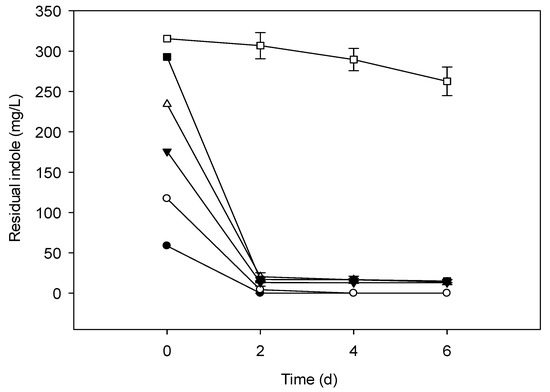 Indole removal capability of TAT1-6A strain at different initial concentrations (mg/L). Symbols: Solid circle, 58.58; open circle, 117.15; solid triangle, 175.73; open triangle, 234.30; solid square, 292.87; open square, 351.45; error bars, mean ± SE of three replicates at 31 °C and pH 6.