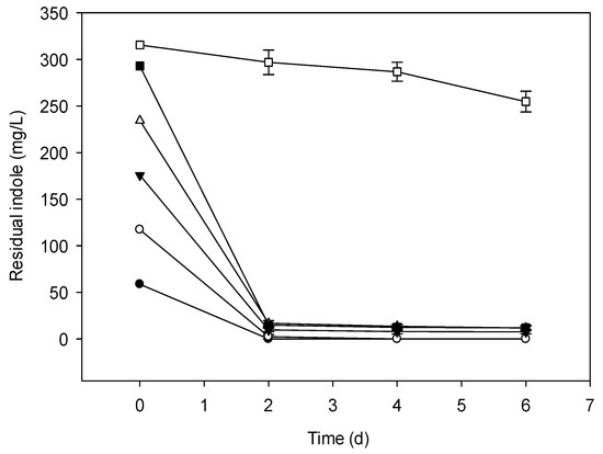 Indole removal capability of a mix of two strains (NTA1-2A and TAT1-6A) at different initial concentrations (mg/L). Symbols: Solid circle, 58.58; open circle, 117.15; solid triangle, 175.73; open triangle, 234.30; solid square, 292.87; open square, 351.45; error bars, mean ± SE of three replicates at 31 °C and pH 6.