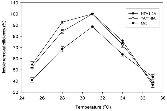 Effect of temperature on indole removal efficiency (%) at pH 6 and 117.15 mg/L (1.0 mM) of indole concentration incubated for 96 h. Error bars: Mean ± SE of three replicates.