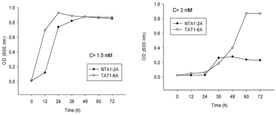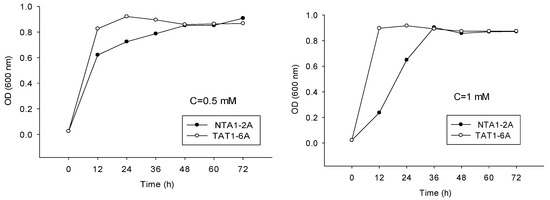 Proliferation of Strains NAT1-2A and TAT1-6A at concentrations (C) of 0.5 mM (58.58 mg/L); 1.0 mM (117.15 mg/L); 1.5 mM (175.73 mg/L) and 3.0 mM (351.45 mg/L) of indole for 72 h.