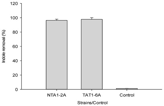 The strains NTA1-2A and TAT1-6A were tested for enzymatic activity of indole degradation. The culture media of the strains were filtered, and the supernatant fluid was used to incubate 120 mg/L of indole for 48 h at 31 °C. Concentration of indole was determined after incubation at 31 °C for 48 h.