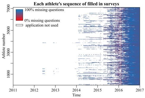 Survey completion by all athletes. Absence of linepieces indicate ‘missing’ surveys; color indicates the amount of missingness within surveys. There are filled in surveys throughout the entire sequence, although usage in 2011–2012 is so sparse that it appears as though there are none.