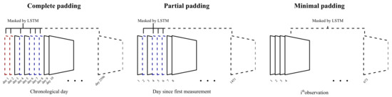 Since participants started using the application at different times, the second method ignores the missing days prior to a participant’s first entry (partial padding). In other words, the first day of entry was considered to be day 1. While this method cannot account for effects of a particular day (e.g., there might have been a national holiday), it reduces the total sequence length, which in turn reduces the model complexity and computational cost.