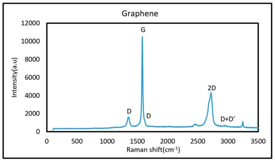 Raman spectroscopy allows us to determine the characteristics of the nano additives used in this research. It identifies defects in the carbon lattice by generating different intensity peaks using nondestructive methods. As illustrated in Figure 2, Raman spectroscopy illustrates the main peaks at different wavelengths of ~1354 cm−1 (D band), ~1581 cm−1 (G band), and ~2719 cm−1 (2D band). The sp2 D carbon mode requires defects for activation which is illustrated by the D band intensity. In addition, the narrow G band demonstrates that optical E2g phonons are in the Brillouin zone due to stretching in sp2 chains, bond, and rings. The D + D’ peak at ~2959 cm−1 shows the exfoliation of graphite. The intensity ratio at the D and G bands is important to understand the transformation of sp3 to sp2 conversion of carbons; further, it is directly proportional to the defect rate. This graphene sample, Id/Ig is 0.153, is very low compared to restored graphene, proving that this graphene has very few defects in the carbon lattice [27,28]. Along with that, lower D band intensity, with respect to G band, support less lattice defect in graphene layers [29].