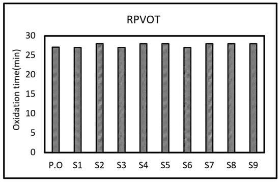 Anti-oxidation capabilities of lubricants were evaluated using the rotating pressure vessel oxidation test (RPVOT) as per ASTM standards. For sustainable improvement, it is important to consider the lubricant’s service life, as lubricants that are not antioxidant can start causing cavitation in the system, which requires changing parts and lubricant. This damages the economic performance of the industry and generates environmental waste. As shown in Figure 5, there is no significant difference in oxidation time using these additives compared to base oil oxidation time. Base oil has shown oxidation time as 27.1 min under the same conditions. This proves that except for S-1, S-3, and S-6, all other samples increase oxidation stability, which allows the lubricant to have a longer service life. Test results conclude that this additive will not damage the economic performance of industries if it is added to the lubricant.