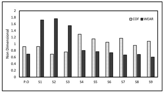Further investigation of the wear track was conducted when the surface texture was examined as per ISO standard 25178. Different data were recorded including arithmetic mean height, which is important for understanding the surface waviness of the scar. As demonstrated in Figure 8, S-1 and S-5 show higher mean height with respect to the other samples, which disclose that larger peaks and valleys were found on the substrate. S-9 reveals the lowest mean height, indicating a smooth wear track.