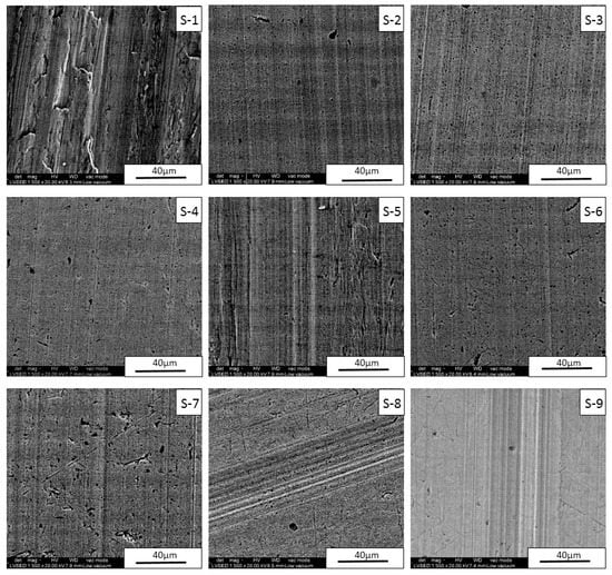 Analysis of the worn disk helps us to understand the difference in the wear characteristics of different nano additives to lubricants. Disk wear track was evaluated at the 40 µm resolution and 1500 kx magnification in a low vacuum chamber using SEM as revealed in Figure 7. The worn surface of S-1 reveals that abrasive and adhesive wear can be seen from surface damage. This can be the result of debris penetration at the contact patch, which leads to the generation of rough surfaces. S-2 and S-3 show a higher number of pits on the surface, which can be caused by the micro crack on the substrate surface. Along with that, these pits cause an imbalance in the elastic hydrodynamic condition which can also cause corrosion on the surface [31]. Morphology of S-4 and S-6 express smooth wear tracks; however, longer surface removal marks can be seen, which indicates adhesive wear. In addition, for S-5 some plastic deformation can be found on the side of the surface. This kind of adhesive wear can be caused by micro cracks, which enlarge under continuous loading conditions. S-7 shows fatigue wear where micro cracks enlarge gradually, which causes removal of surface material that can also be called mechanical pitting. In S-8 and S-9, smooth wear track marks are visible on the substrate, which displays slight adhesive wear; however, no plastic deformation nor any abrasive wear is seen on these samples.