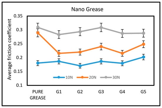 The average friction coefficient of nano additive grease at 10 N, 20 N, and 30 N normal load.
