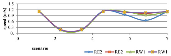 In the areas and ramps characterizing the monitored track, a range of speeds of 0.308 m/s was evaluated, characterized by cold blue tones in the images to follow up to 2.7 m/s characterized by warm red tones. Therefore, in Table 8, it is denoted that a fluid and constant flow is characterized by high speeds and warm colors and that this concept becomes critical in some scenario conditions where speeds are reduced almost to block the flow.