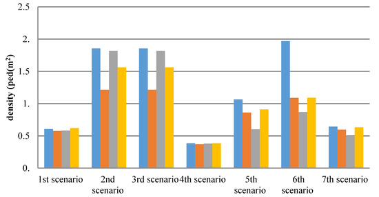 The density value according to the HCM standard, as shown in Table 5, is also estimated. Once the model has been calibrated it has been shown that the results obtained by micro-simulation reflect the realistic results for the basic scenario (daily situation) with 1.500 ped/h and maximum daily scenario with 3.000 ped/h. The other scenarios have been defined and simulated in order to prevent congestion and related problems. Considering the data obtained through the calibration and validation of the model, the micro-simulation results are defined in terms of the density (number of pedestrian/m2) as shown in Figure 5. It is possible to see that the scenario titled “4th” relating to the partial maintenance activities increases the density to a value double compared to the flow conditions in daily conditions with 3.000 ped/h.