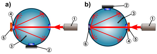 Measurement system. (a) Mode for the measurement of diffuse reflectance Rd, (b) mode for the measurement of diffuse transmittance Td. 1—Light source, 2—detector, 3—baffle, 4—sample port, 5—examined sample, 6—unused plugged port.