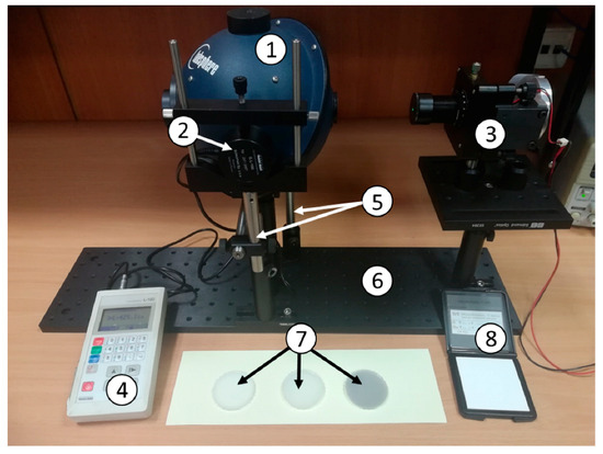 The integrating sphere, the light source and the luxmeter measuring head were precisely mounted on a 15 × 60 cm optical breadboard (Thorlabs, Newton, NJ, USA) to provide acceptable system stability, which allows for the acquisition of accurate results. Furthermore, the integrating sphere can be rotated around its own axis, which helps to quickly change between configurations for transmittance and reflectance measurement. The stoppers, properly set on either side of an integrating sphere, guarantee that the sphere rotates exactly 180°.