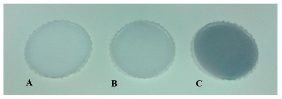 Produced phantoms. A—reference Ø = 45 mm, d = 2 mm; B—with the addition of India ink (5 µL) Ø = 45 mm, d = 2.6 mm; C—with the addition of India ink (20 µL) Ø = 45 mm, d = 2.3 mm.