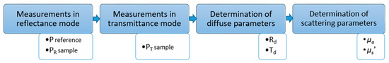 Block diagram of the data analysis algorithm, where PR—reference measurement using the CS-A21 white calibration plate in reflectance mode. PR sample, PT sample—measurements of the investigated phantom in reflectance and transmittance modes, respectively. Td—diffuse transmittance. Rd—diffuse reflectance. µa—absorption coefficient. µs′—reduced scattering coefficient.