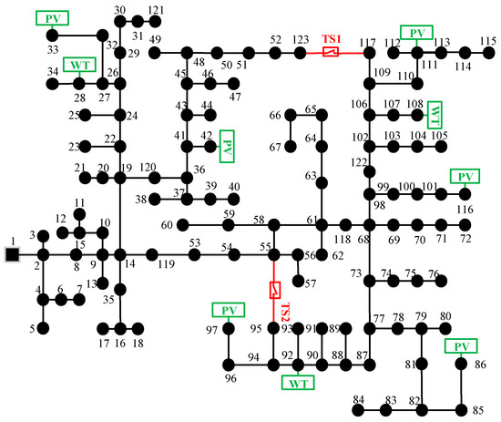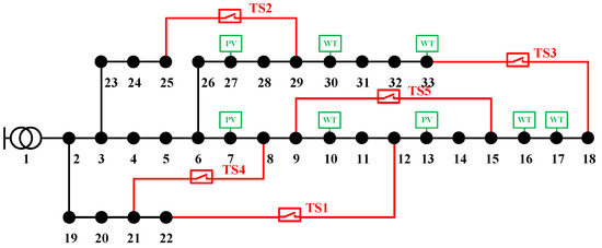 In this section, the effectiveness of the proposed method is analyzed and verified on a modified IEEE 33-node system [34]. The voltage level is 12.66 kV, the total active load is 3715 kW, and the total reactive load is 2300 kvar. The test case is shown in Figure 1.