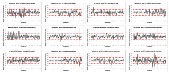 Figure 3 shows the variation profiles in rows from left to right in monthly order. The red dotted lines represent the variation criteria value. The gap between the yellow dotted lines signifies the peak period. Unlike other seasons, the wind power generation variation was unstable in winter from January to March and from November to December. The variation profiles in other seasons were mostly within the criteria. There were no noticeable trends in the variation profiles except in terms of seasons.