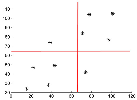 Here, a grid of one row and one column is taken for example as Figure 1 shows. All data points are divided into four areas: top left, top right, bottom left, and bottom right. The numbers of data points belonging to each area are 1, 4, 4, and 1. Then, the normalized numbers of data point frequencies in the four regions are 0.1, 0.4, 0.4, and 0.1. Herein, X has two values: left and right, and Y has two values: upper and lower. The joint probabilities of the data in four regions can be calculated as , , , . Therefore, the point frequencies in X, Y are , , and . According to the mutual information calculation formula introduced above, the mutual information of X and Y is obtained as Equation (3).