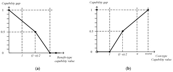 In addition, the capability can be classified into benefit and cost types. Firstly, the relation between a single capability of a solution and corresponding capability requirement is defined based on three premises: (1) When a capability of a solution is deficient or worse than the inferior value of the corresponding capability requirement interval, which means the solution absolutely cannot meet the capability requirement. Its capability gap is supposed to be 1. (2) When a solution can provide a capability, with its value falling in the interval of corresponding capability requirement, its capability gap should be a number between . Especially when the solution’s capability value exactly falls in the middle of the capability requirement interval, the capability gap is supposed to be 0.5, which means the capability can meet the capability requirement by half. (3) When a capability of a solution equals to or better than the superior value of the corresponding capability requirement interval, it means that the capability can absolutely meet the corresponding capability requirement, and the capability gap is supposed to be 0.