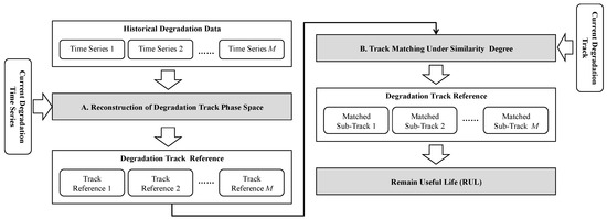 The key resource for predicting RUL is the operational data, which is typically obtained from embedded sensors with time series. In specific, the degradation data is analyzed to support the construction of the RUL prediction model and the main steps can be concluded as degradation track phase space construction, track matching, and RUL prediction. Detailed procedures are given in Figure 3.