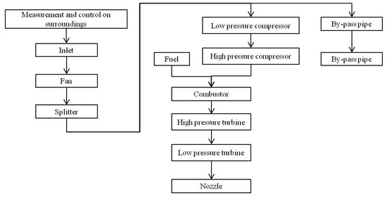 The C-MAPSS simulates the operation of a turbine engine with 900,000-pound thrust and records monitoring signals. Based on the principle of thermodynamics, two failure modes are designed: high-pressure compressor degradation and fan degradation. The main functional modules and connections are shown in Figure 6. The simulation runs in the following settings: