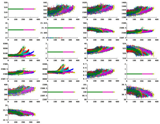 Due to the fact that the constant variable is unable to reflect the evolution of engine degradations, variable 1, 5, 6, 10, 16, 18, and 19 are not regarded as feature variables. What’s more, the tracks exhibit different trends in terms of variable 9 and 14, so variable 9 and 14 are inadequate to describe the degradation process.