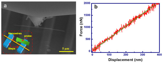 For the anode materials of high-performance SIBs, a flexible structure with a low modulus of elasticity along the stress direction is necessary [22]. The elastic constant of the NTO NW was then further studied using a SEM/SPM combined system. In Figure 4a and the inset schematic diagram, the SEM images of the mechanical test and experimental model are presented. The result of the relationship curve between the load and displacement of the NTO NW, as shown in Figure 4b, is a proportional relation. Therefore, the Young’s modulus E can be computed using the following equation [23]: