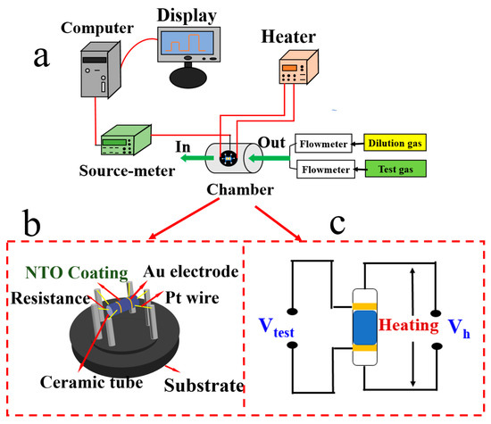 Self-assembly gas-sensitive testing system. (a) Schematic model; (b) Testing chamber of the gas sensor; (c) Circuit diagram of the gas-sensitive test.