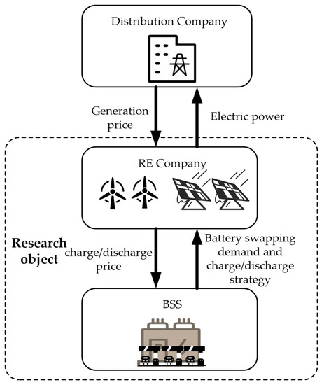 In [12], an economic dispatch model of the microgrid including the RE and BSS is established, and the economy of microgrid operation is improved through the cooperative optimization of the RE and BSS. The uncertainty of RE generation and battery-swapping demand is further considered in [13]. A stochastic optimization model of the microgrid including the RE and BSS is established based on the chance-constrained programming. In [14], a multi-objective cooperative optimizing model of the BSS and RE is established by fully considering the randomness. By adjusting the charging and discharging power of the BSS in coordination with the RE, the load fluctuation and network loss is reduced effectively, and the planning penetration of the RE is improved as well. However, these studies need the grid company as a coordinating body to coordinate and control a variety of dispatchable resources. Because of this, these studies are based on the interests of grid companies, while the interests of RE and BSS are not fully considered.