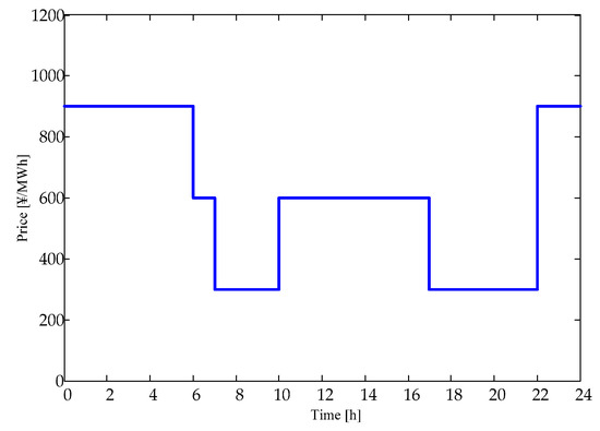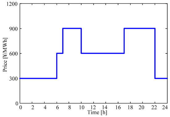 The decisions are taken at the end of the day for each of the 24 h of the following day. Therefore, Nt is 24, and Δt is 1 h. The distribution company purchase price of RE is known, and the TOU price was adopted as shown in Figure 4. The division of peak and valley periods draws lessons from the division method of industrial electricity consumption price in Shandong Province. The price of wind power in Shandong Province is about 600 ¥/MWh. Therefore, we set the purchase price in the normal period as 600 ¥/MWh. The price in peak period is 1.5 times the one in normal period, and the price in valley period is half the one in normal period.