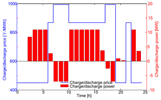Comparing Figure 4 and Figure 5, it can be seen that the changing trend of charge/discharge price is basically consistent with that of the RE purchase price of the distribution company. During periods of low purchase price of distribution company, such as period 0–6, the RE company sets a low charge/discharge price, and directs the BSS to charge and to store power. During the period of high purchase price of the distribution company, such as period 20–21, the RE company sets a high charge/discharge price to attract BSS to discharge, so as to increase the revenue of electricity sale of the RE company.