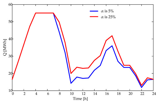In Figure 6, we compare the remaining energy of the BSS when α is 5% and 25%. When α is 25%, the remaining energy of the BSS is higher in each period of time, which indicates that the BSS has prepared more backup batteries to satisfy the battery-swapping demand. During the high charge/discharge price periods, such as time intervals 8–10, BSS is unable to sell more energy to the RE company to raise income. Therefore, the BSS’s ability of “charging in low-price period and discharging in high-price period” is weakened, which is adverse to the interest of the RE company and the BSS.