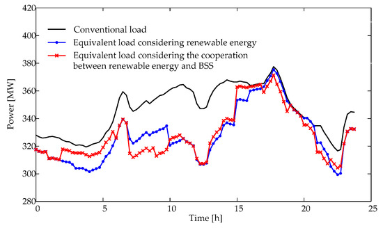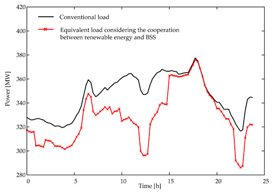 Figure 7 shows a comparison of the peak-valley difference of the power grid load under different conditions. It can be seen from Figure 7, when there is no RE, that the peak-valley difference of the power grid load is 61 MW. When RE is directly connected to the grid, the peak-valley difference of the equivalent load taking the RE output into account is increased to 76 MW. However, when the RE company and BSS work together, the peak-valley difference could be reduced to 67 MW by adjusting the output of different time intervals in response to the purchase price of the distribution company.