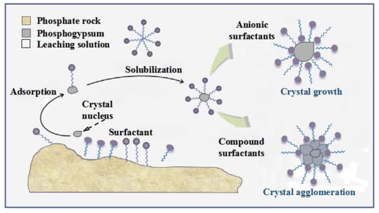 Key processes during the wet process of producing phosphoric acid are the leaching behavior and crystallization process of phosphogypsum. CaSO4·2H2O is the main content of phosphogypsum; its crystal structure and particle size can directly affect the filtration rate and the loss rateof phosphate. Many materials can improve the crystal structure during the production process of CaSO4·2H2O, e.g., activated carbon, activated silicone, aluminum sulfate, and some inorganic compounds [,,,] as well assome polymers and surfactants, phosphoric acid, and carboxylate.