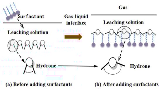 The addition of surfactant could decrease the interface energy and block the hydrogen bond to rearrange the water molecule, and then increased the bond-angle of water [] (Figure 3), thus decreasing the surface tension and enlarged the contact area of leaching solvent and phosphate rock, which favored the mass transfer rate and improved the leaching efficiency.