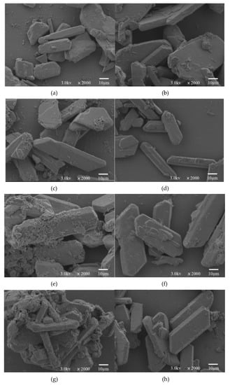 Effect of surfactants on phosphogypsum crystal. (a) SEM of gypsum crystals without surface active agent. (b) SEM of gypsum crystals with SDBS. (c) SEM of gypsum crystals with SDS (d) SEM of gypsum crystals with SR. (e) SEM of gypsum crystals with PDMS. (f) SEM of gypsum crystals with SDBS+SDS. (g) SEM of gypsum crystals with SDBS+SR. (h) SEM of gypsum crystals with SDBS+PDMS.