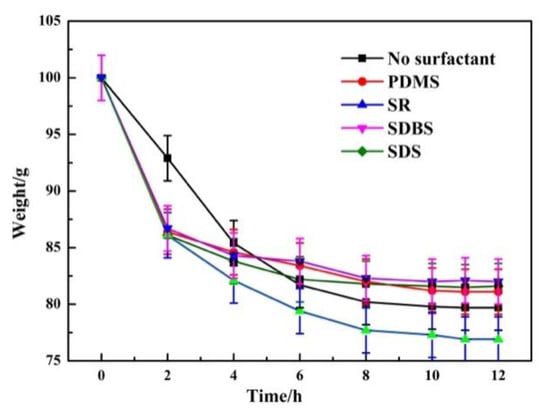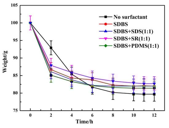 The effect of coupled surfactant on the water content of phosphogypsum was investigated with SDBS+SDS (1:1), SDBS+SR (1:1), and SDBS+PDMS (1:1). The loss of phosphogypsum mass is shown in Figure 7.