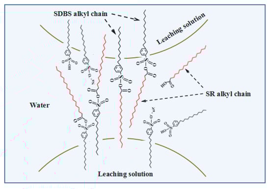 The results shown in Figure 8 indicate that the water-loss rate was faster than blank group with addition of SDBS+SDS (1:1), SDBS+SR (1:1) or SDBS+PDMS (1:1). Table 8 displayed the effect surfactant on water content of phosphogypsum. The water content was decreased to 18.0%, 17.3% and 18.6%, respectively, with addition of SDBS+SDS (1:1), SDBS+SR (1:1), and SDBS+PDMS (1:1). The synergistic effect was not obvious, as SDS and SDBS had the same hydrophobic group. SR reacted with SDBS to form complex compound (Figure 8), which was easy to overcome the low hard water of SDBS. The coupling of SDMS and SR showed good synergistic effect.